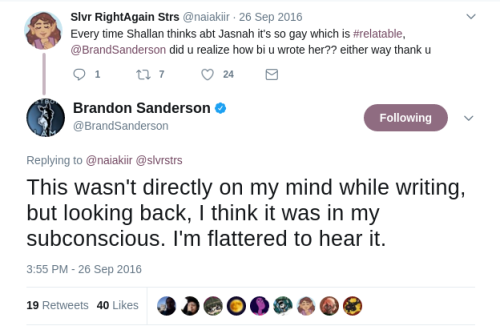 Oh, thanks for finding that! That's interesting! I wonder if he's going to write her as more overtly bi in Rhythm of War? I certainly hope so.I appreciate that he's trying to ease into the queer representation, but I do think he has a long ways to go. Still, we can hope. :)
