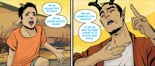 Jayson wrote: "@Shira Some Esperanto from Volume 2, for your reference. As I mentioned, it's scattered throughout the series, always written in blue text :)"